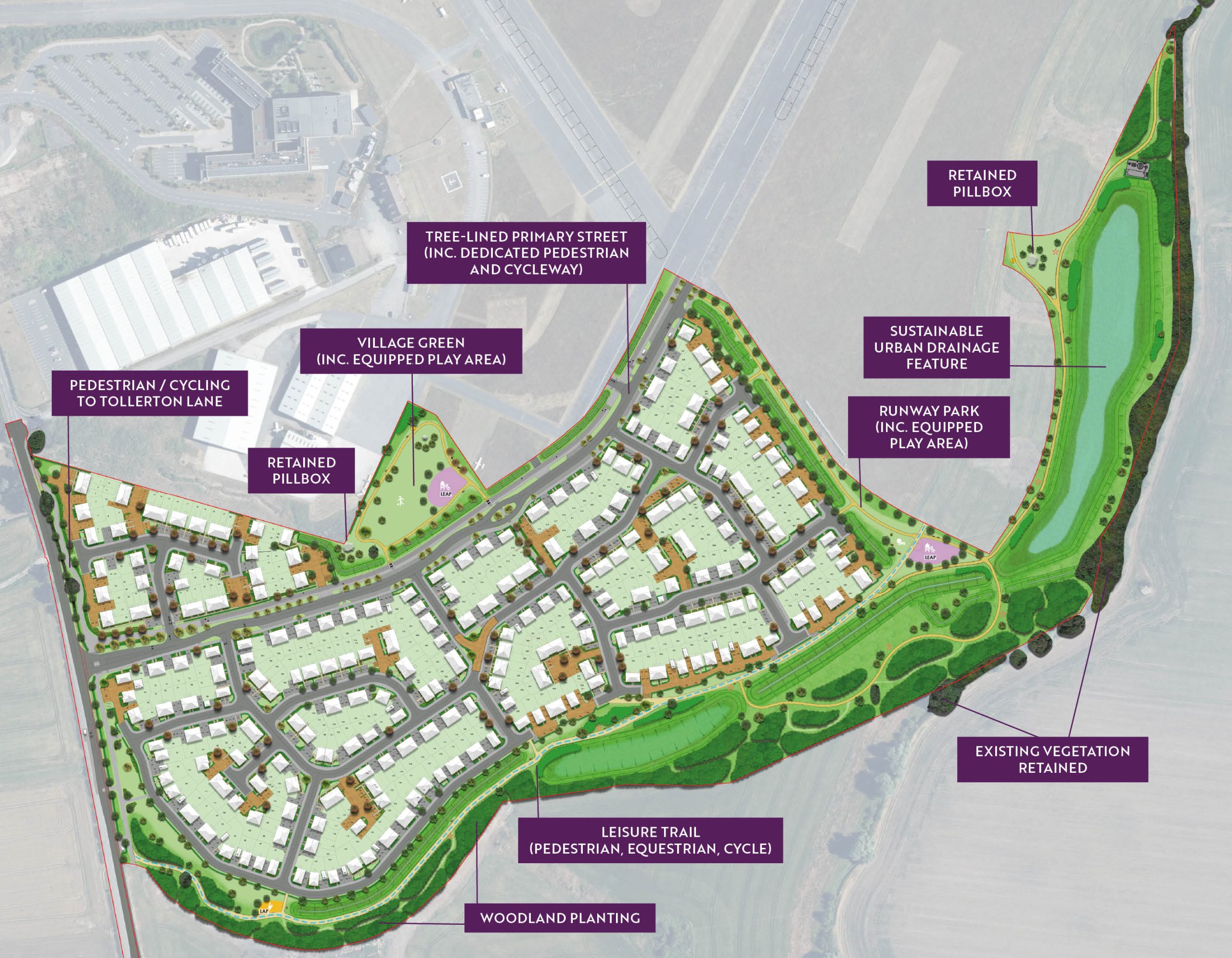 The hybrid application includes a full application for the first phase of development. This is for 381 new homes, an equipped children’s play area and supporting infrastructure, including sustainable drainage features (SuDS). Vehicle access will be from the southern access from Tollerton Lane.